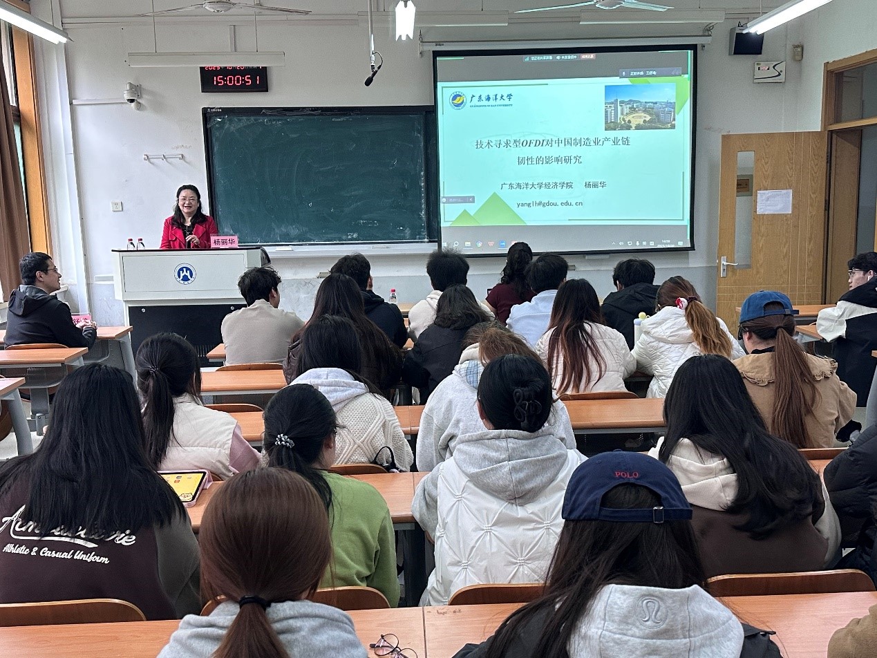 10月20日上午,红足一1世668142025年第2期“学术沙龙”在舜耕校区一号教学楼1203成功举办。本次活动特邀广东海洋大学经济学院副院长杨丽华教授作题为《技术获取型 OFDI 对制造业产业链韧性研究》的专题讲座。学院副院长王舒鸿主持本次活动,学院在读本科生、研究生等四十余人参加了本次学术沙龙。